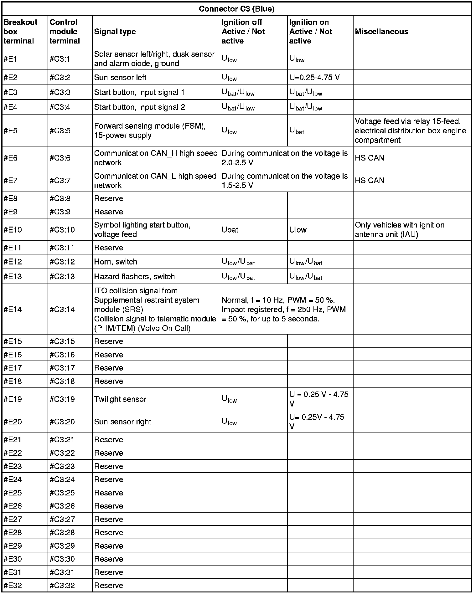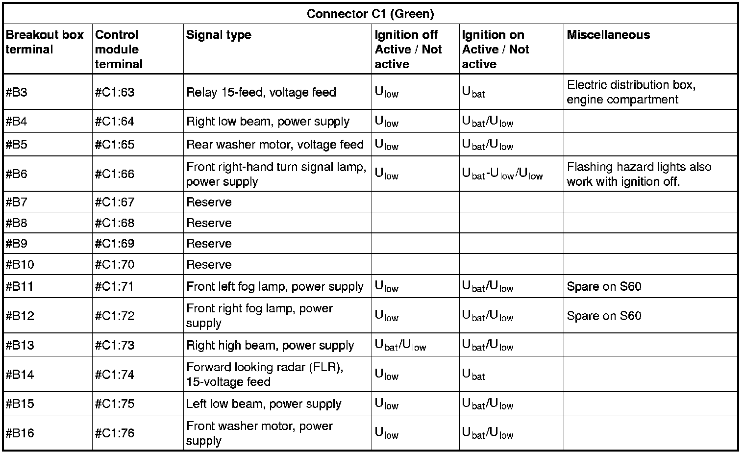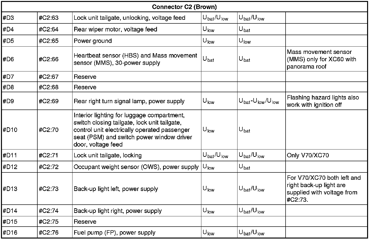 All values given below are between the terminals stated in column 1 and terminal #D5 (power ground). This applies unless otherwise indicated in the last column.