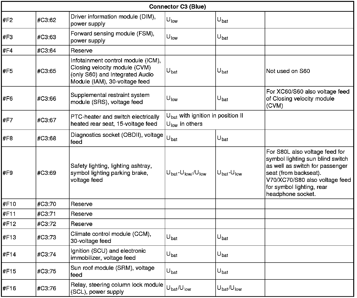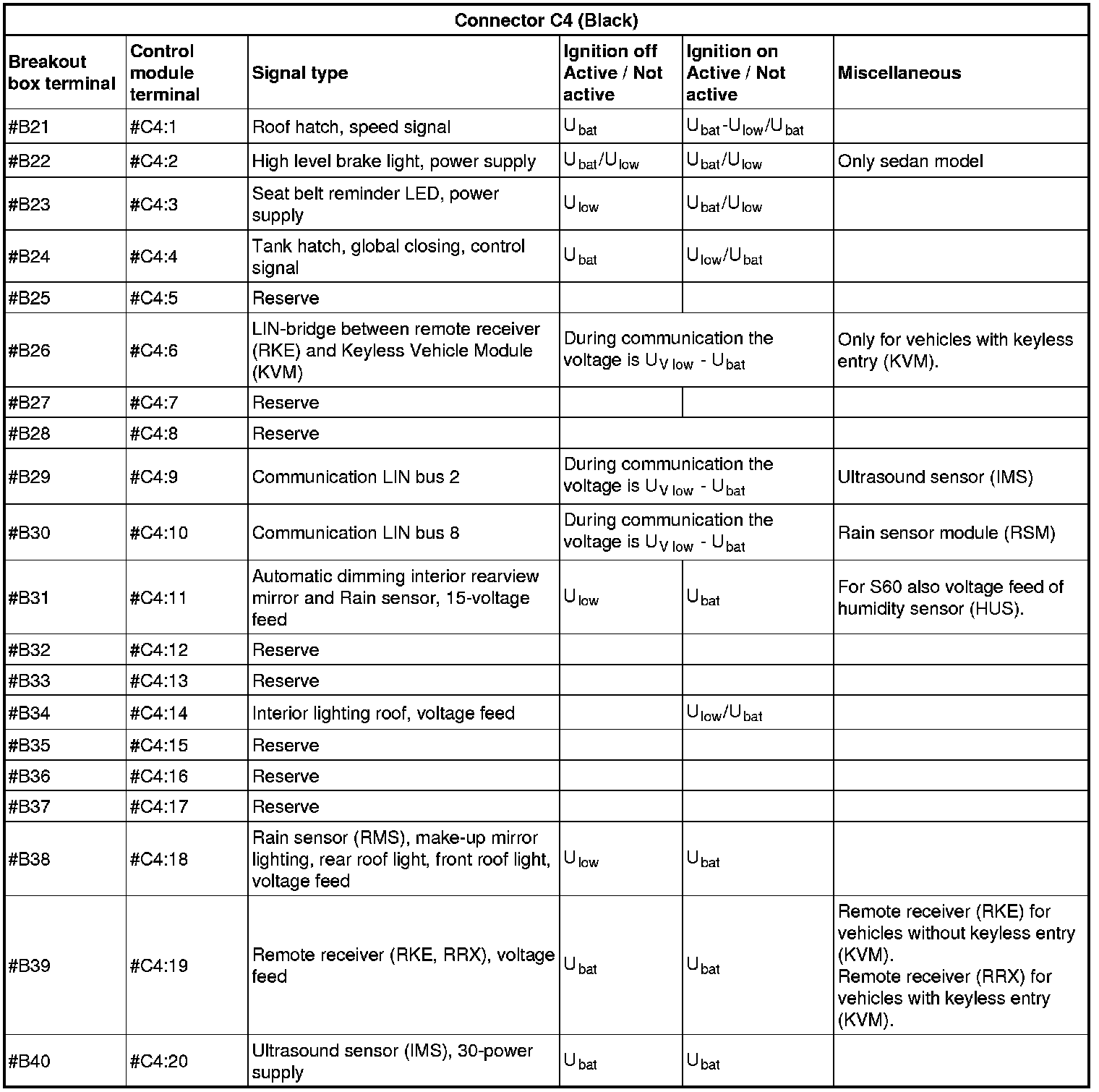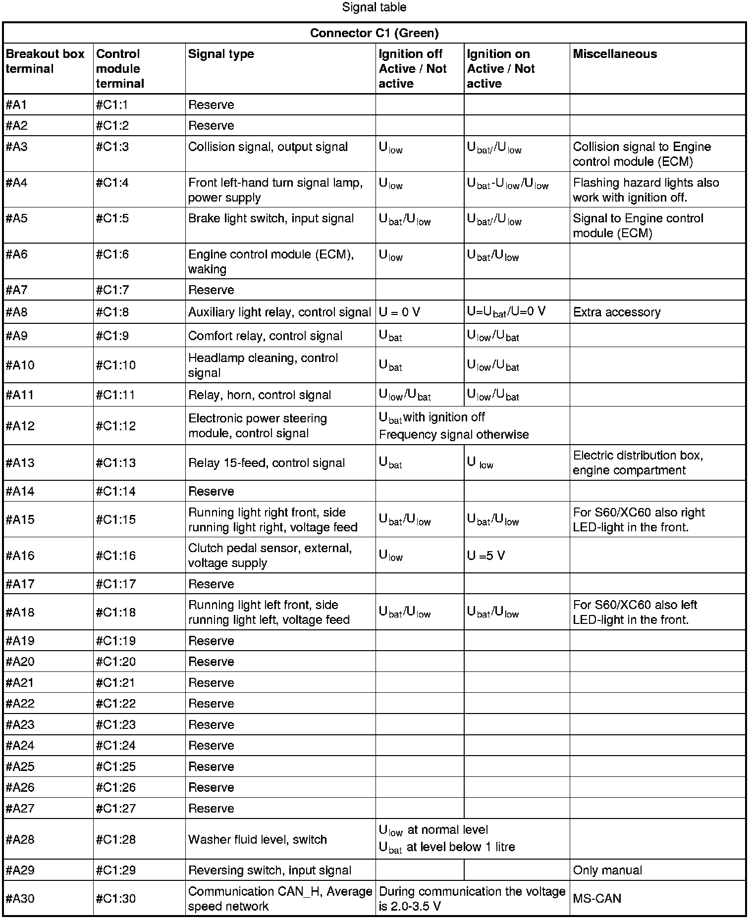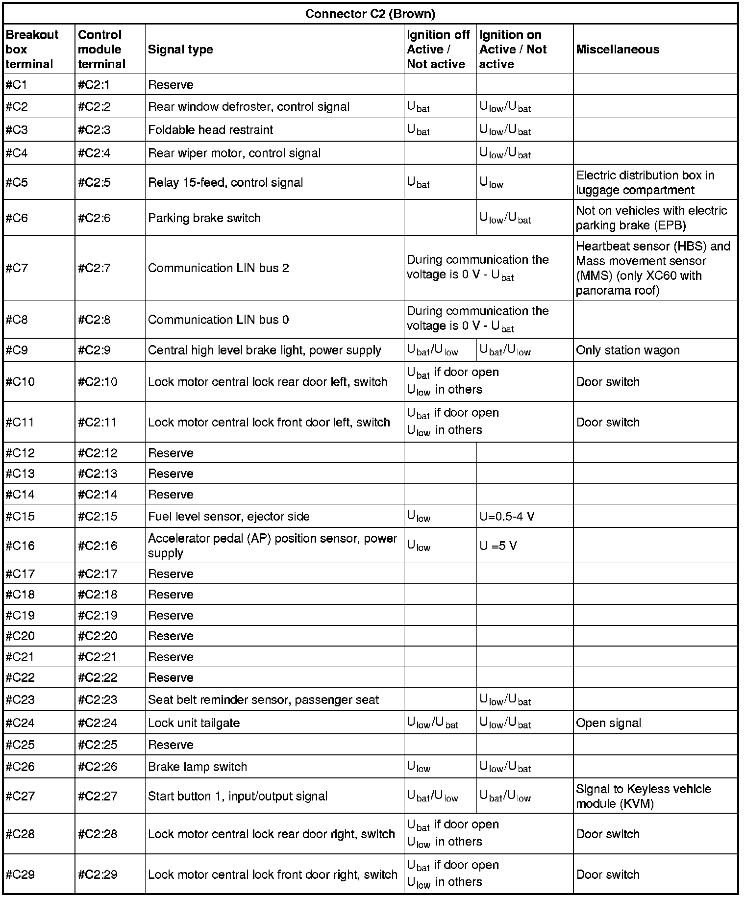 All values given below are between the terminals stated in column 1 and terminal #D5 (power ground). This applies unless otherwise indicated in the last column.