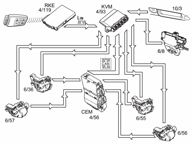 Note! The market in Japan has Remote Keyless Entry (RKE) regardless of if the vehicle is equipped with keyless entry system or not. When the vehicle is not equipped with keyless entry system, the Remote Keyless Entry (RKE) communicates directly with Central electronic module (CEM). If the vehicle is equipped with keyless entry system, the Remote Keyless Entry (RKE) communicates via Keyless Vehicle Module (KVM).