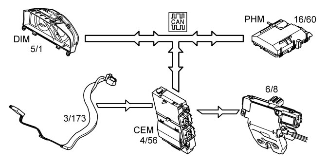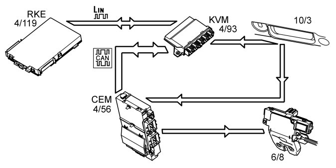 The vehicle is locked using the lock buttons on the door handles. During locking, the antenna is also activated to check that there is an authorized remote key in the vicinity of the vehicle. If the remote key is approved, the keyless vehicle module (KVM) transmits a signal to the central electronic module (CEM) to lock the vehicle.