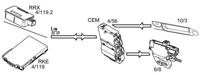 Note! The market in Japan has Remote Keyless Entry (RKE) regardless of if the vehicle is equipped with keyless entry system or not. When the vehicle is not equipped with keyless entry system, the Remote Keyless Entry (RKE) communicates directly with Central electronic module (CEM).