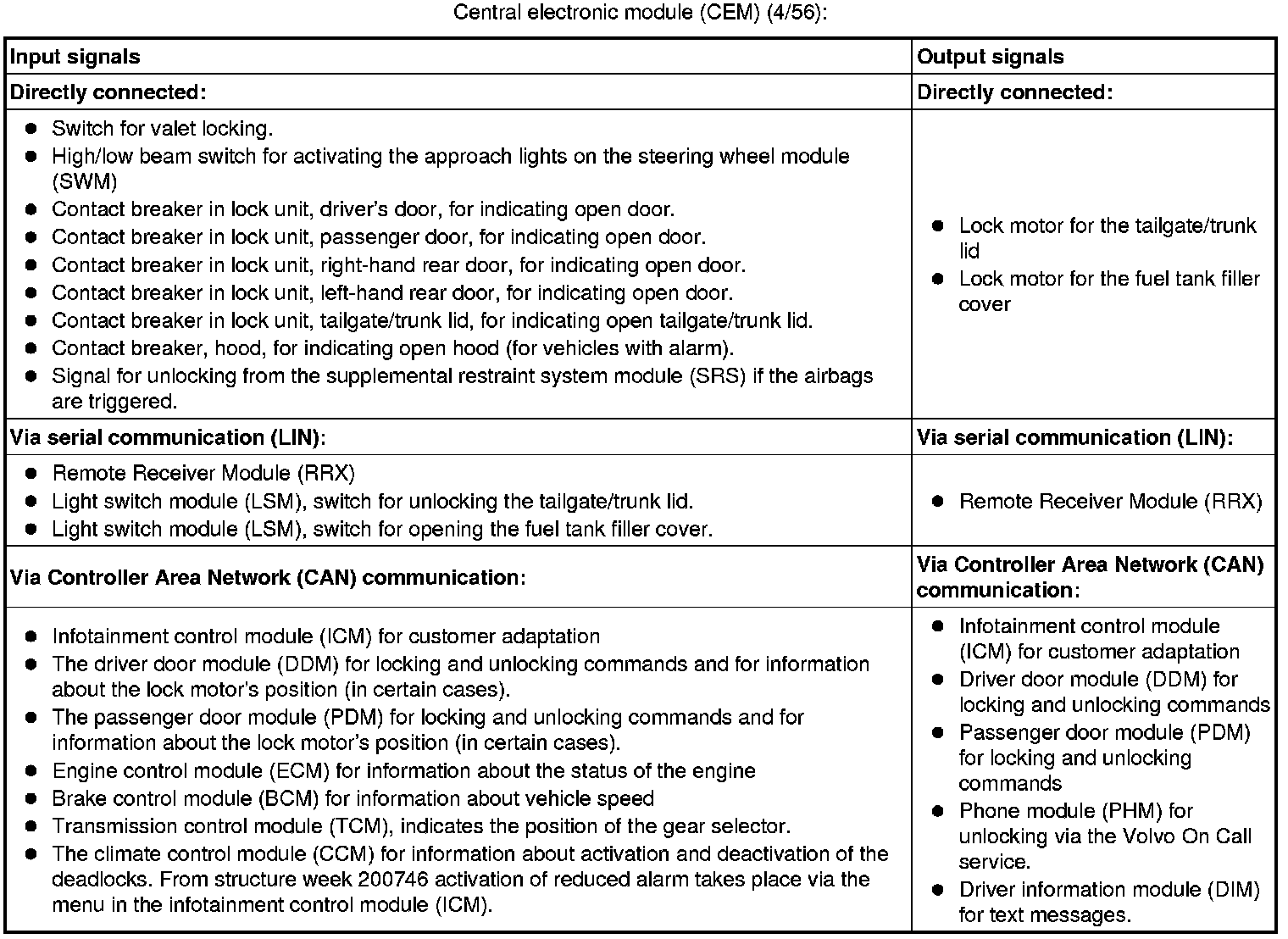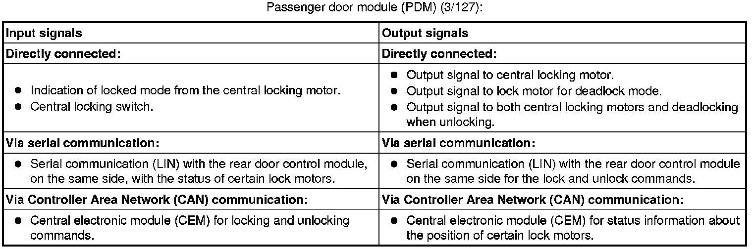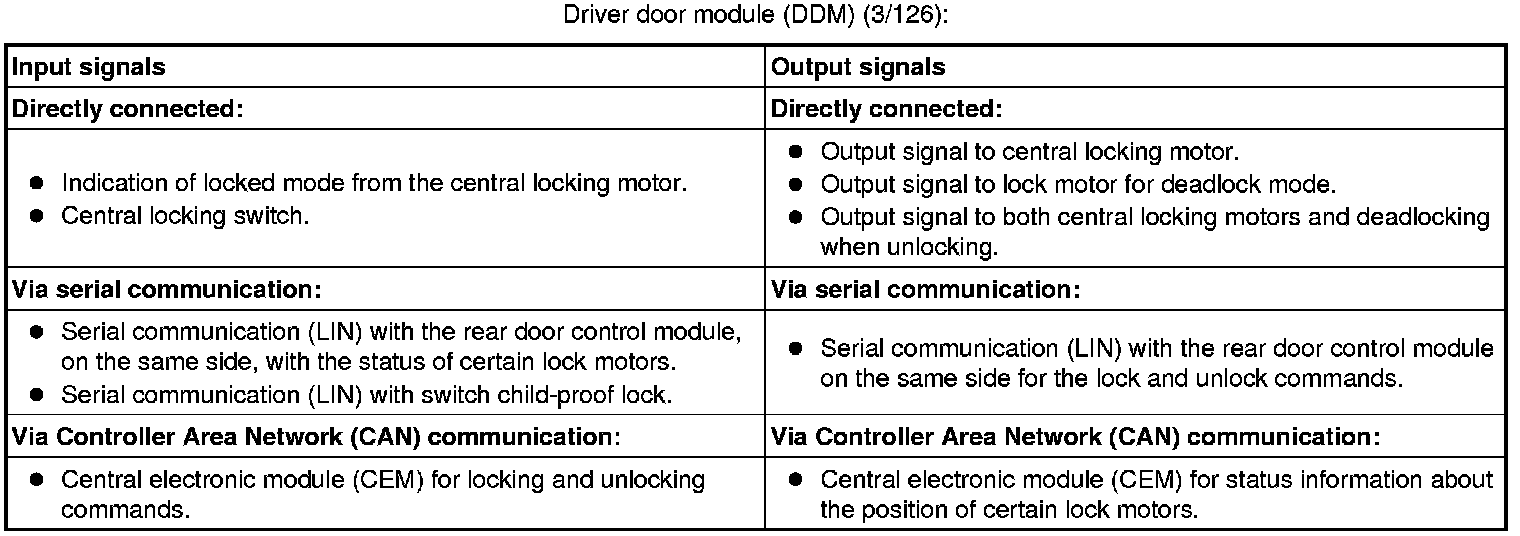 The tables below summarize the input and output signals to the units in the central locking system. The signal types are divided into directly connected signals, serial communication and controller area network (CAN) communication.