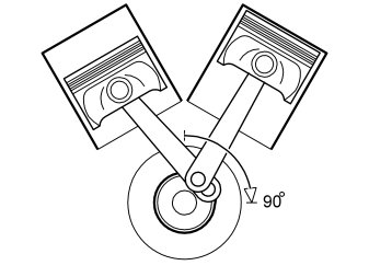 When the crankshaft has rotated 90 degrees the right hand piston is at the top and the left hand piston is halfway between the upper and lower turning points.