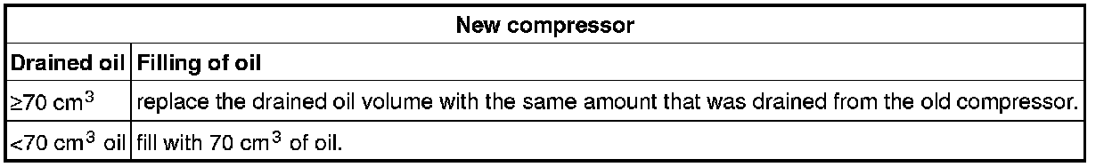 Change the oil in the compressor (reusing the compressor) or replace with the same amount that was in the old one (new compressor) according to the tables below. Carry out a performance test of the air conditioning system. Refer to: Climate control system, check Climate Control System, Check.