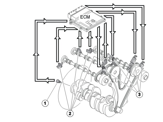 The engine control module (ECM) detects the position of the camshafts by comparing the signals from the engine speed (RPM) sensor (1) (crankshaft position) and the camshaft position (CMP) sensors (2) (camshaft positions). The engine control module (ECM) then controls the angle of the camshaft by controlling the oil flow to the CVVT unit using the reset valve camshaft (3).