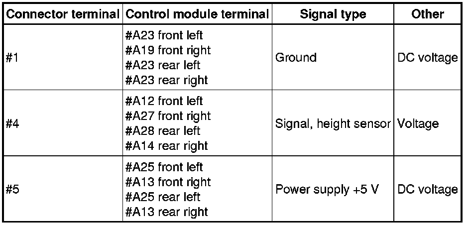 Height sensors on the right and left side have differing output signals during compressed/extended suspension. During compressed suspension, the sensors on the left side have a signal of about 0.5 V while those on the right have a signal of approx. 4.5 V. During extended suspension, sensors on the left side have a signal of approx. 4.5 V while those on the right have approx. 0.5 V.