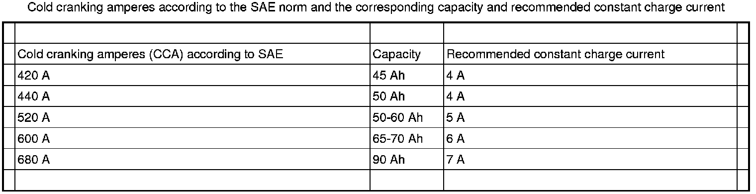 The cold cranking amperes according to the SAE and DIN norms and the corresponding capacity and recommended charge current are shown in the table below.