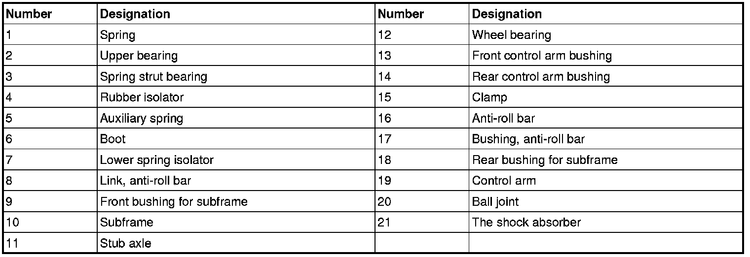 The spring strut consists of shock absorber (21), spring strut bearing (3) with auxiliary spring (5), boot (6), spring (1), upper and lower spring isolators (7), upper bearing (2), stub axle (11) and wheel bearing (12).