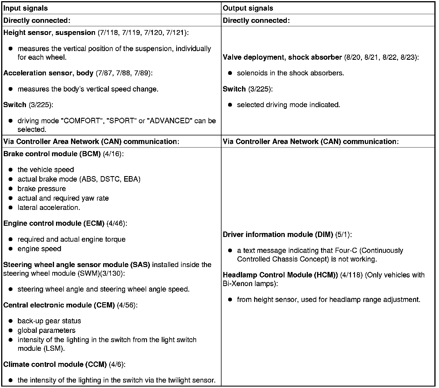 The table below summarizes the input signals to and output signals from the suspension module (SUM). The signals are divided into directly connected signals and CAN communication. The illustration below displays the same information with the Volvo component designations