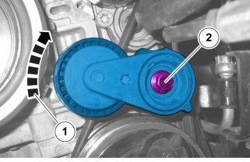 When installing the outer belt tensioner, turn the belt tensioner clockwise (1) and hold it in that position.