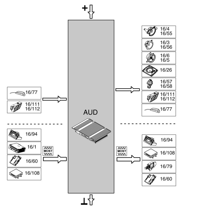 If a subwoofer module (SUB) is installed on the MOST network, the audio module (AUD) transmits signals to the subwoofer module (SUB).