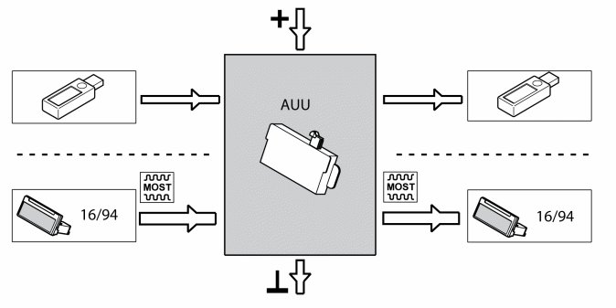The accessory USB unit (AUU) has serial optic communication with components on the MOST network. All communication with the accessory USB unit (AUU) is handled via the infotainment control module (ICM).