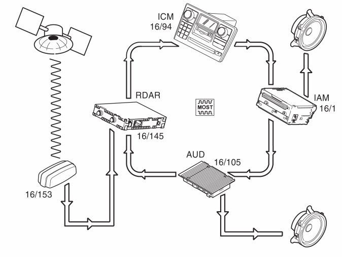During radio reception, the digital radio signals are received by the antenna system and transmitted to the remote digital audio receiver (RADAR) (16/145) where they are decoded. The remote digital audio receiver (RADAR) then transmits the signals onwards via the MOST network to the infotainment control module (ICM) (16/94) and the integrated audio module (IAM) (16/1) or the audio module (AUD)(16/105) depending on the vehicle configuration.