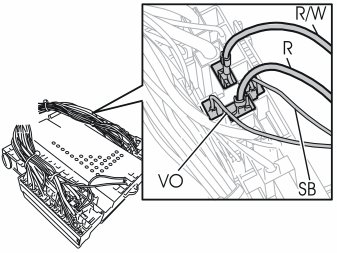 - Connect the new red (R) cable to terminal 19 in the connector. If the car is prepared for rear air conditioning (A/C) there is already a cable installed in this terminal. Disconnect the cable. Insulate the cable. Secure the cable. Press in the new red (R) cable instead