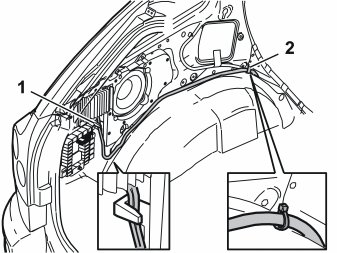 - Now adjust the routing of the cable harnesses up to the front edge of the wheel arch so that it reaches the subwoofer Carefully press the cable harness under the lower edge of the subwoofer so that it remains in place. Clamp the cable harness at point (2) using a cable harness from the kit.