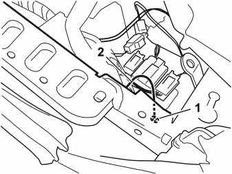 - Slacken off the screw for the existing ground lead under the panel (1). Pull up and connect the routed ground lead (2) together with the existing ground lead. Tighten the screw.