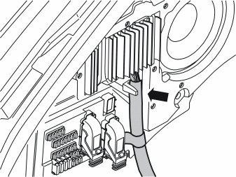 - Press the cable harnesses into place on the subwoofer into the existing clamp (1)