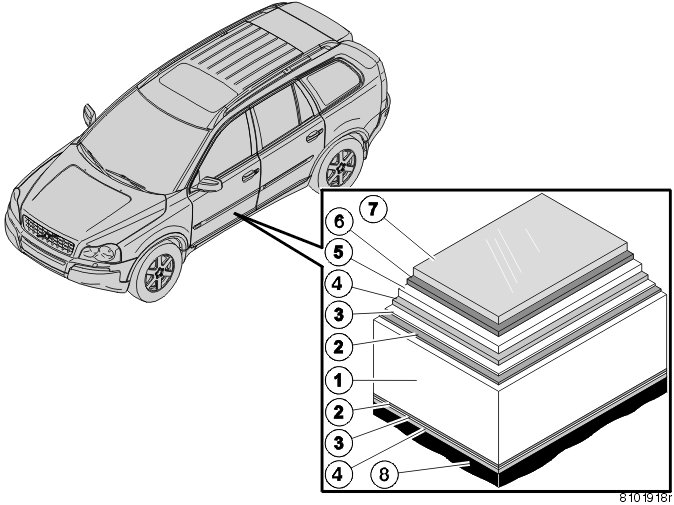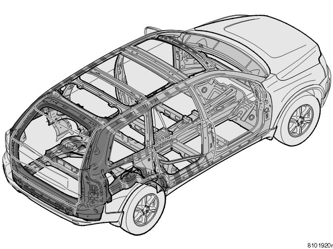 The shape of the XC90 body is based on the same basic design as the V70 body. Front and rear crumple zones absorb collision forces. The passenger compartment has a safety cage in which the door