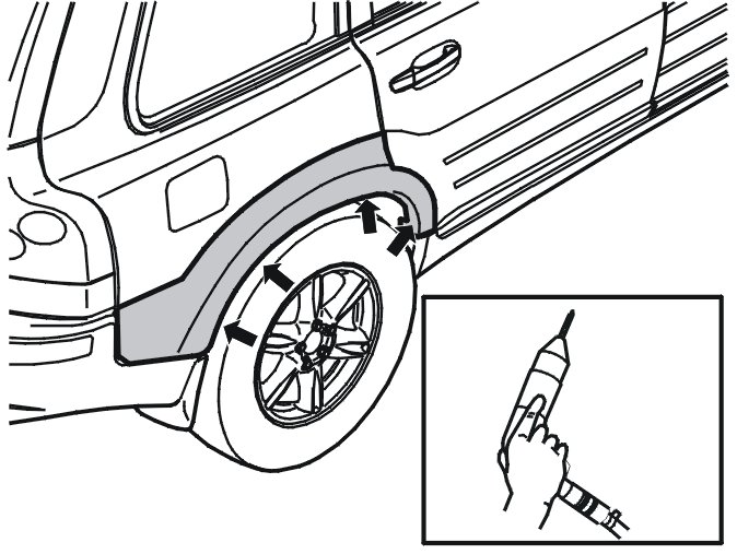 Drill out the rivets in the rear wheel arch. Use a 6 mm (¼ ") diameter drill bit.