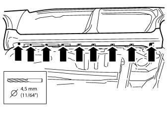 - Drill out the pop rivets at the front edge of the door sill panel and in the rear edge of the wing extender. Use a -6 mm (15/64") drill bit.