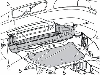 - Remove the engine splash guard (4) by first removing the screws (5).