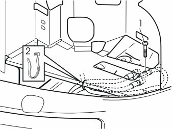 - Remove the branch connector with the cables from the underside of the plate beneath the headlamp. Remove the screw, nut and washer (1) and tie strap (2), and pull the branch connector forward.