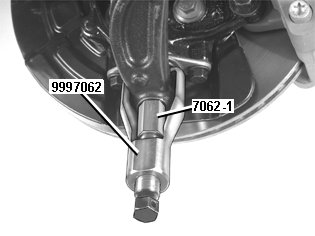 Tap the control arms off of the ball joint pin. Use 999 7076 Lever 999 7076 Lever. Release the drive shafts from the wheel hubs by pressing the drive shafts into the hub.