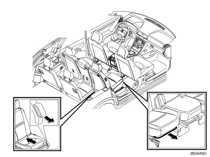 To access the third row of seats, lift the control on the outer backrest on the second row of seats. The backrest folds forwards while the seat moves forward.