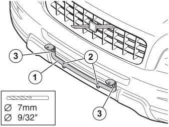 - Drill with a - 7 mm (9/32") diameter drill bit in the centre of the holes (3), through the bumper cover and the bumper rail that is 39 mm (1 1/2") inside.
