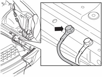 - Twist down the ground cable terminal and position the cable so that it is not pinched by the air filter when it is reinstalled. Route any excess cable through the front grille and clamp at existing cables behind the headlamps with tie straps.
