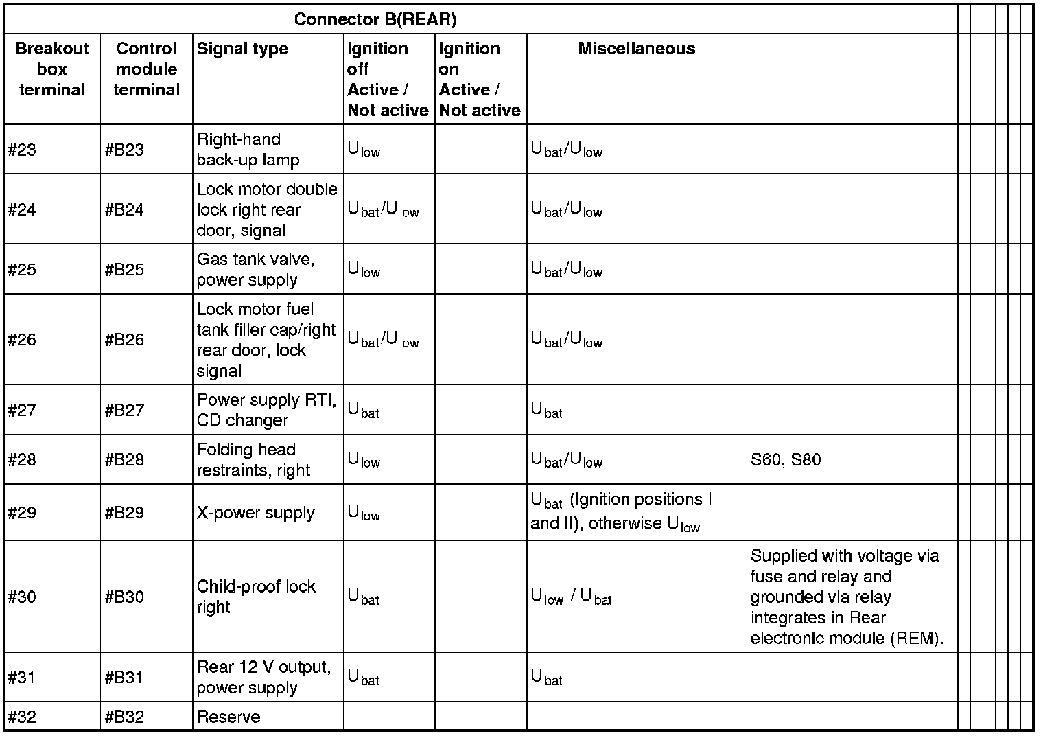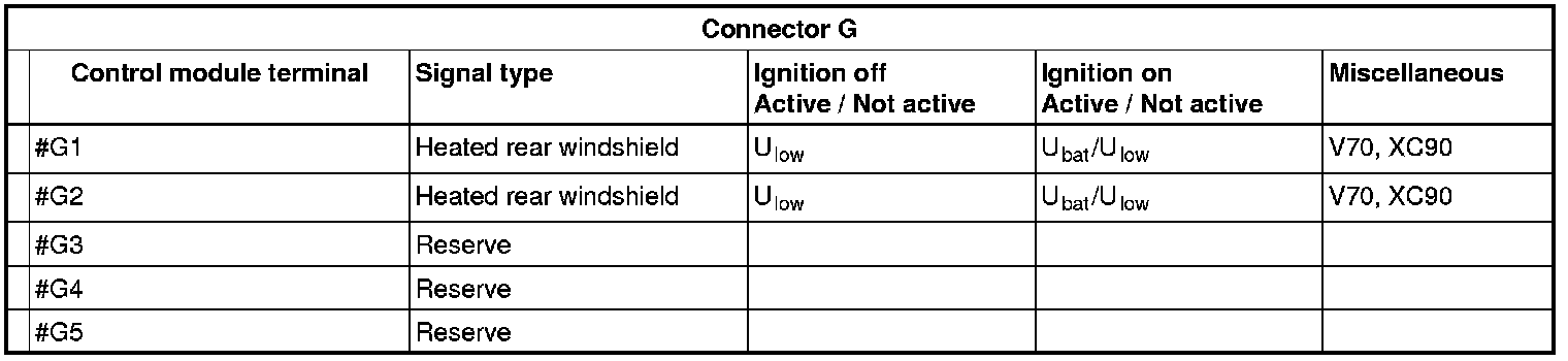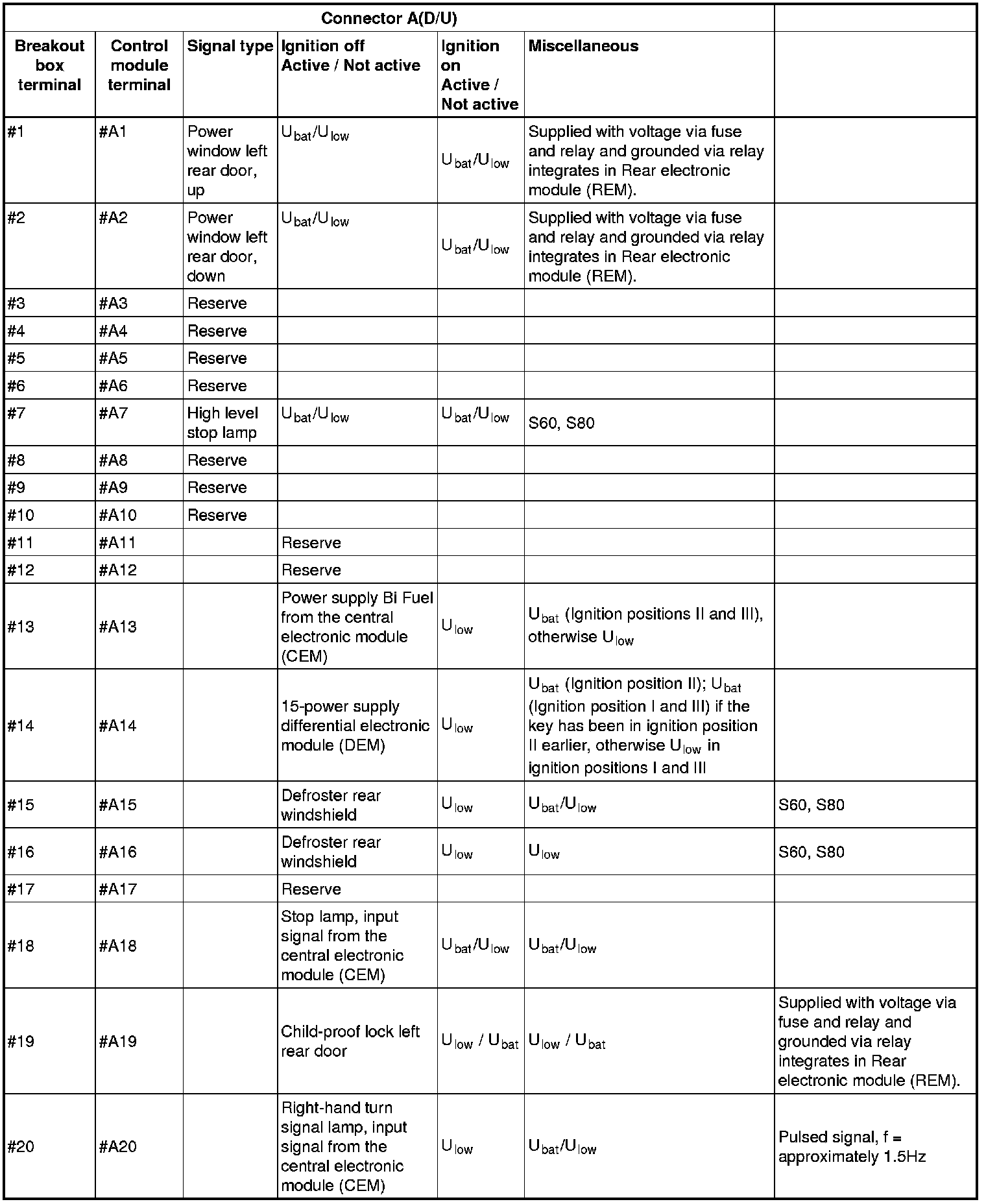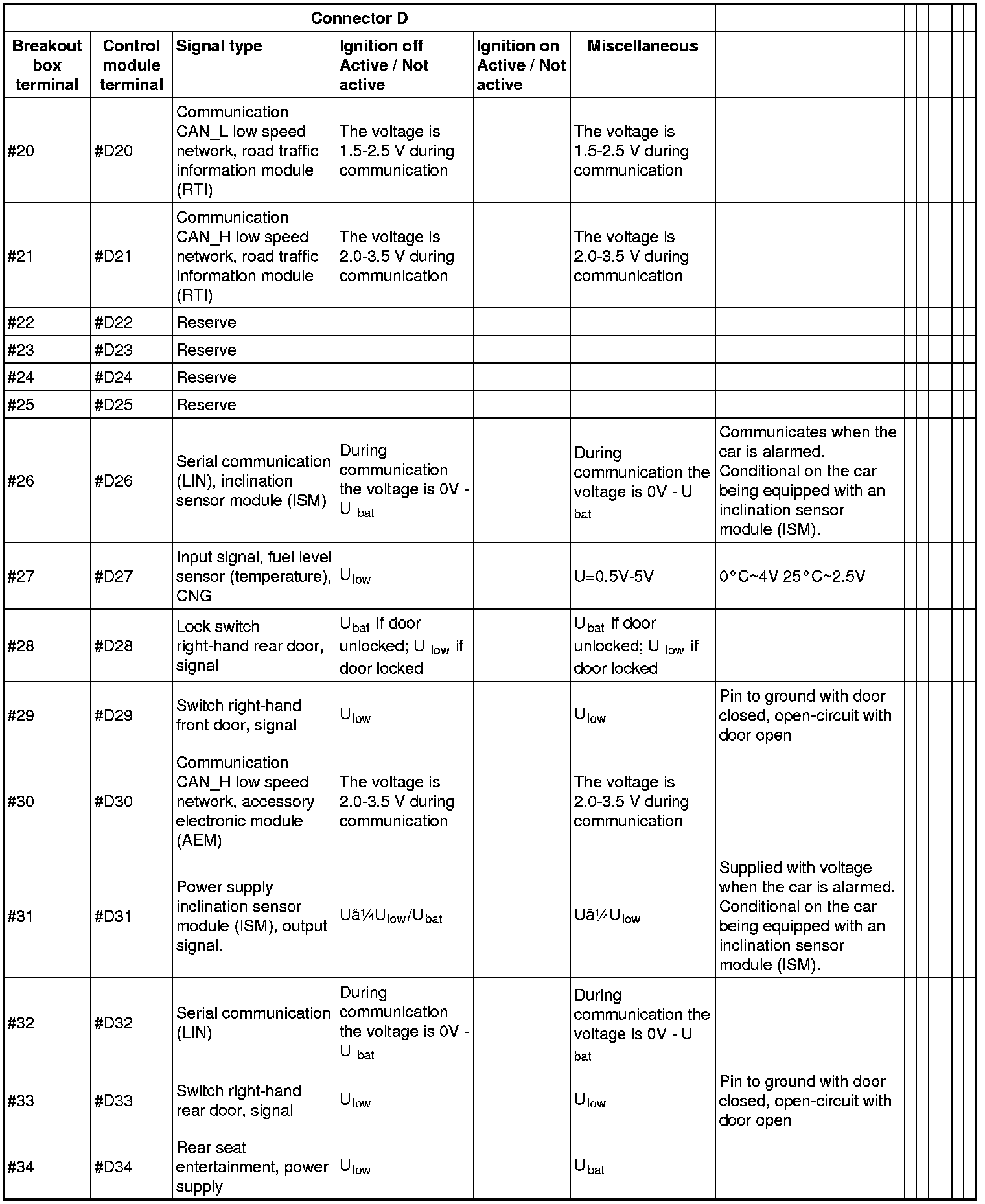 All the values given below are between the terminals stated in column 1 and terminal #D12 in column 2 (power ground). This applies unless otherwise indicated in the last column.