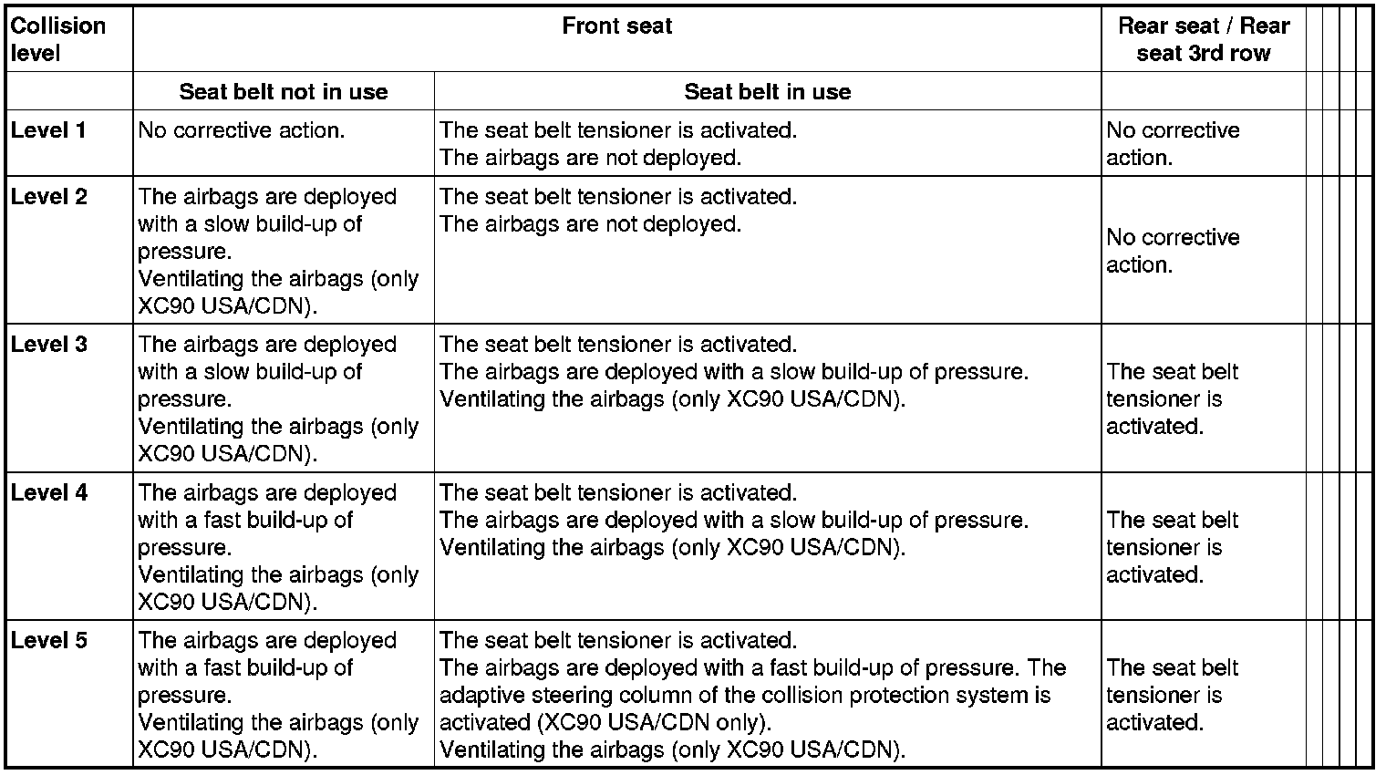 The table below shows how the SRS system reacts in the event of a frontal impact.