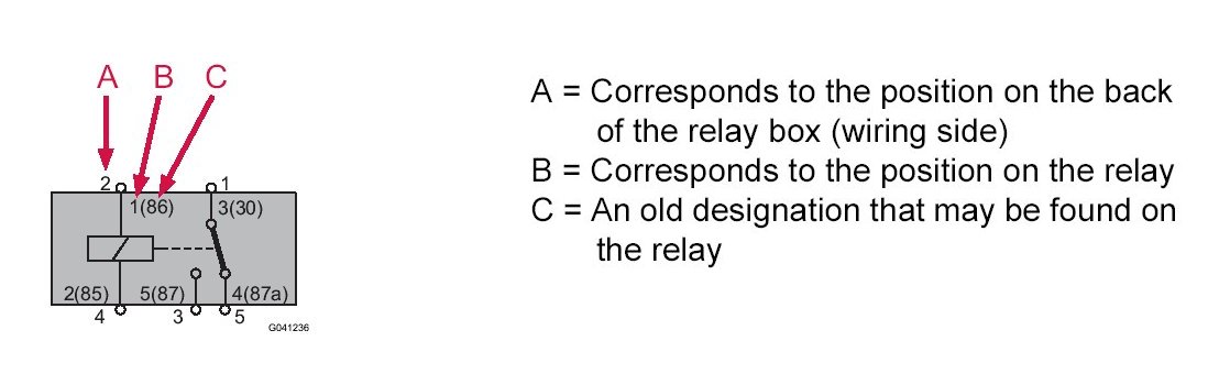 The diagram indicates two or three different designations for the relay's position. This is described below.