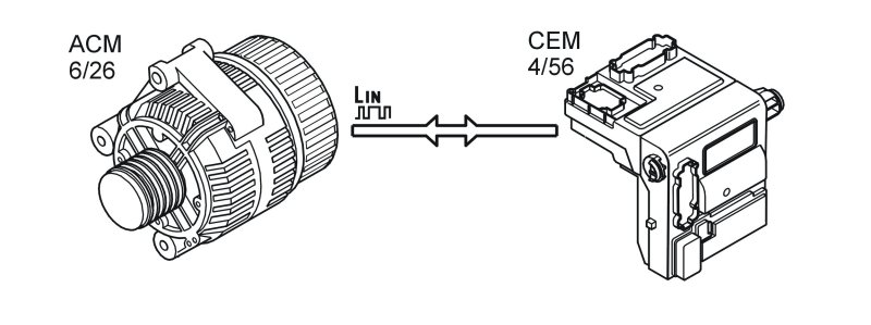 When the ignition key is in position II (or III), the central electronic module (CEM) sends information to the charge regulator (also known as the alternator control module (ACM)) either directly or via the engine control module (ECM).