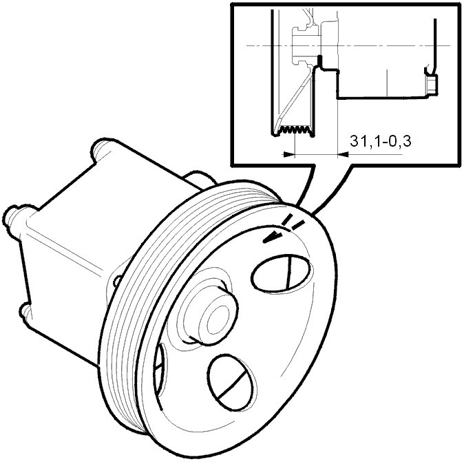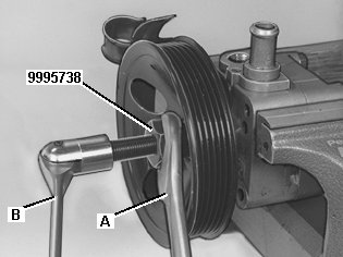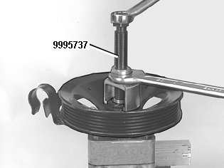 Install tool 999 5628 Press tool 999 5628 Press Tool on the pulley. Hook tool 999 5628 Press tool 999 5628 Press Tool onto the pump shaft screw.