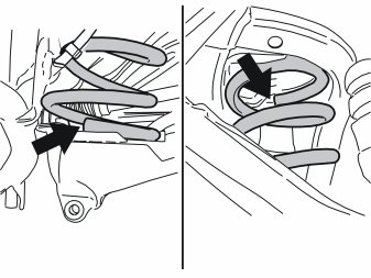- Position the ends of the spring against the stops in the upper mounting and control arm