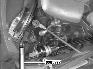 Note! Pull out the drive shaft from the wheel hub whilst raising the stub axle. Angle the shaft past the stub axle.