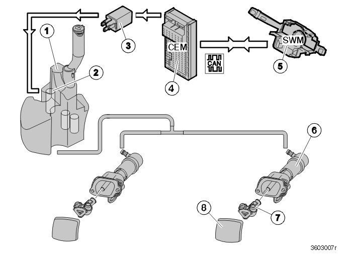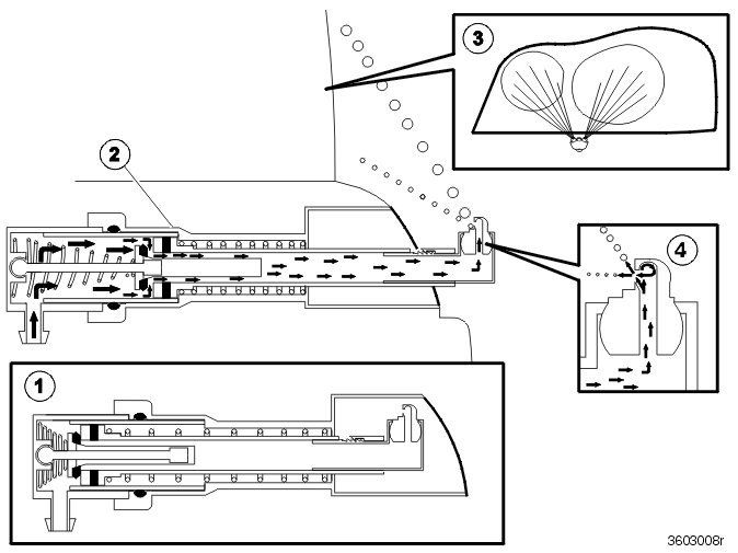 An electrical centrifugal pump increases the pressure of the fluid in the system. The windshield washer fluid presses the pistons out and then flows out through the nozzles and cleans the