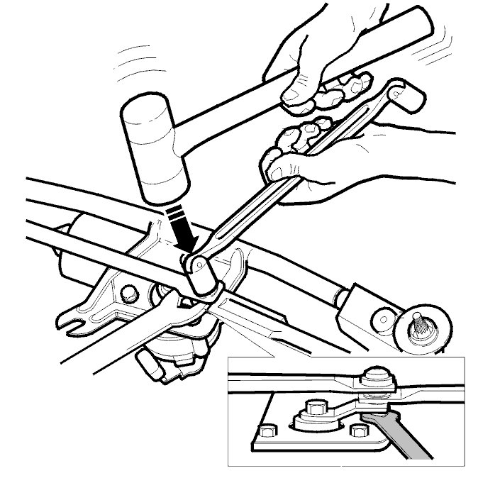 - Position a wrench as support between the link arm and the bracket and screw head. See illustration