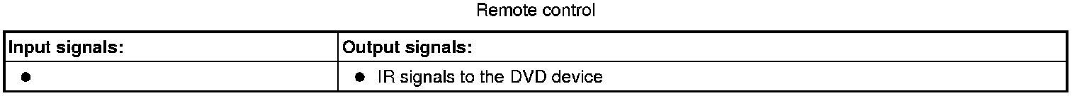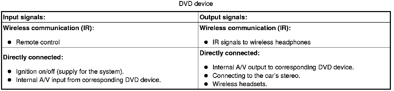 The tables below include the in and output signals for the DVD devices in the system for rear seat entertainment.