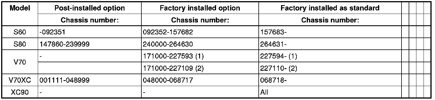 The wiring for the accessory electronic module (AEM) has been post-installed or factory installed as an option on early version cars. The wiring is now factory installed in all cars. See the table below for the chassis numbers.