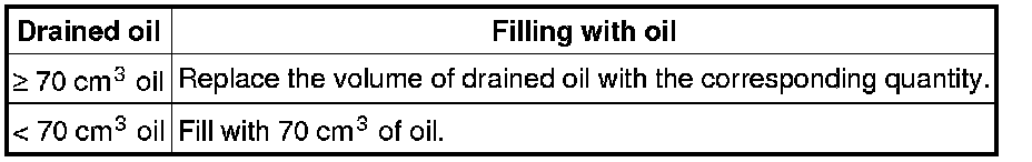 The oil must be topped up when repairing a leak or when replacing a component. The quantity required for the component in question will depend on whether leakage has taken place slowly or quickly.