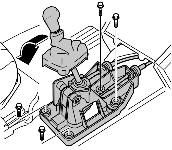 Detach the gear selector assembly (four screws). Turn the gear selector assembly a quarter turn with the control downwards towards the driver's seat.