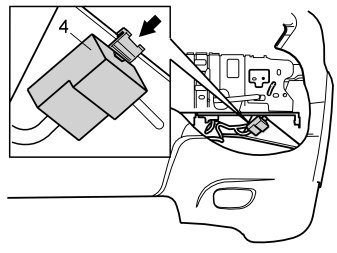 - Press in the relay (4) at the vertical panel, under the panel that the main headlamp rests on. Rotate the relay up so that the connector with the cable does not make contact with panel underneath. See also illustration 8 for the location of the relay.