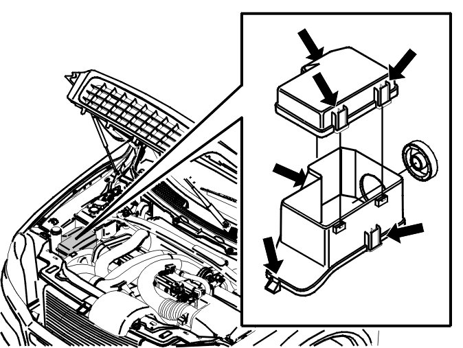 - Remove the power steering fluid and coolant reservoirs. Lift up and move to one side
