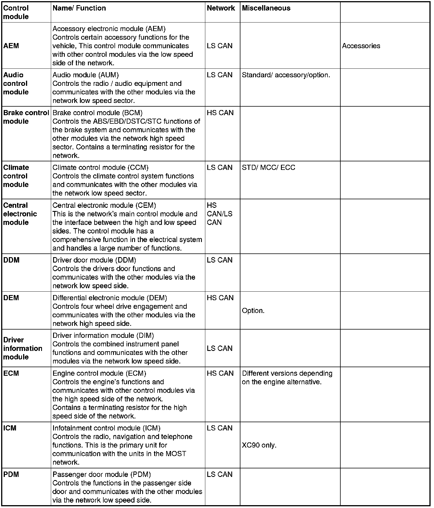 The number of control modules in the CAN network varies depending on the car model, equipment level and structure week, The structure week and construction week are not necessarily the same week. The construction week is the week in which the vehicle is built in the factory. The content of the vehicle is steered towards structure week. A structure week may extend over a number of construction weeks. Structure weeks are specified in the format YYYYWW.