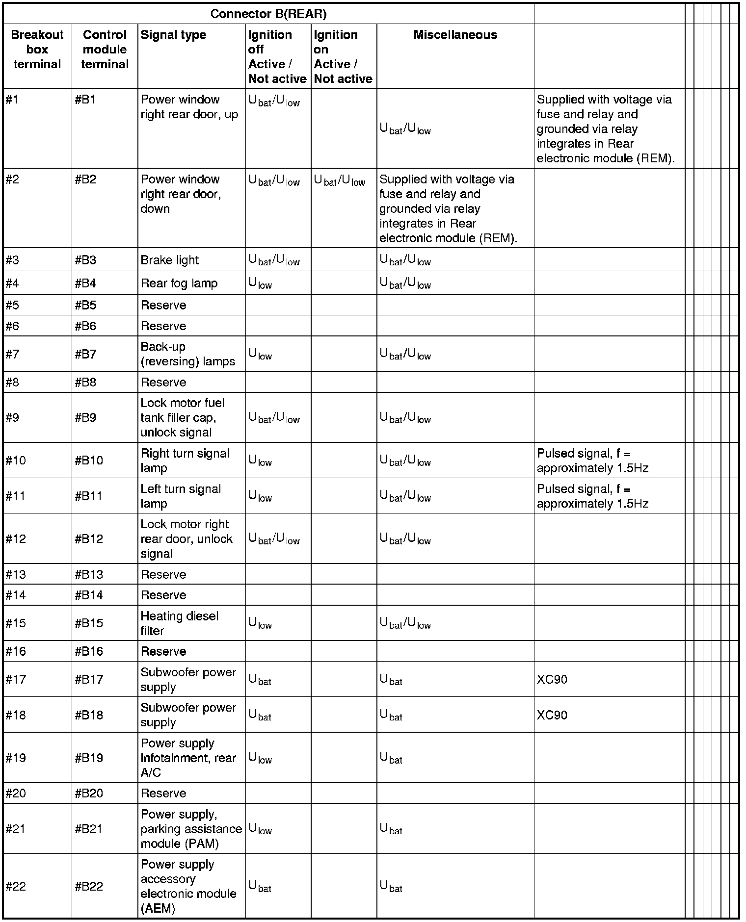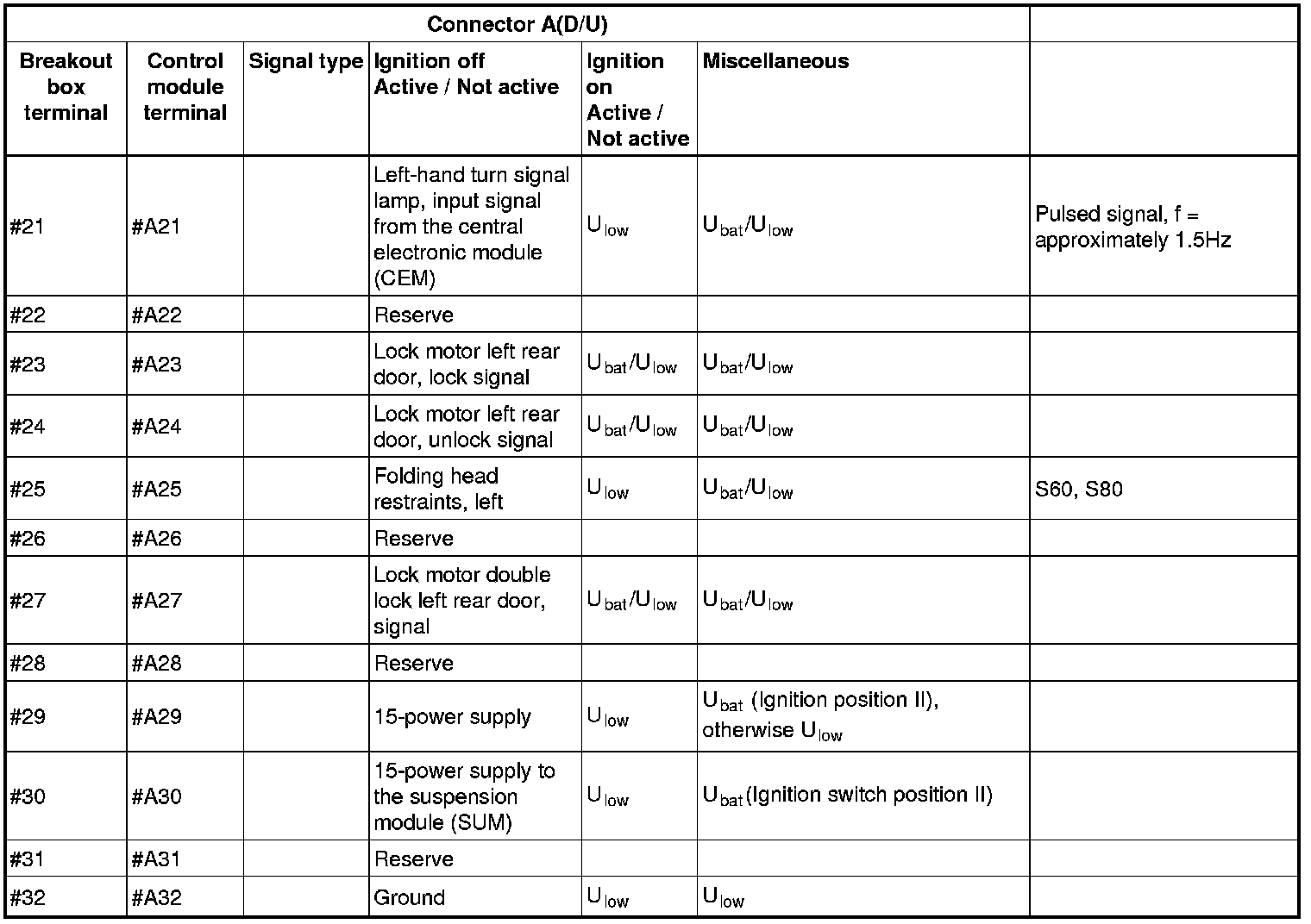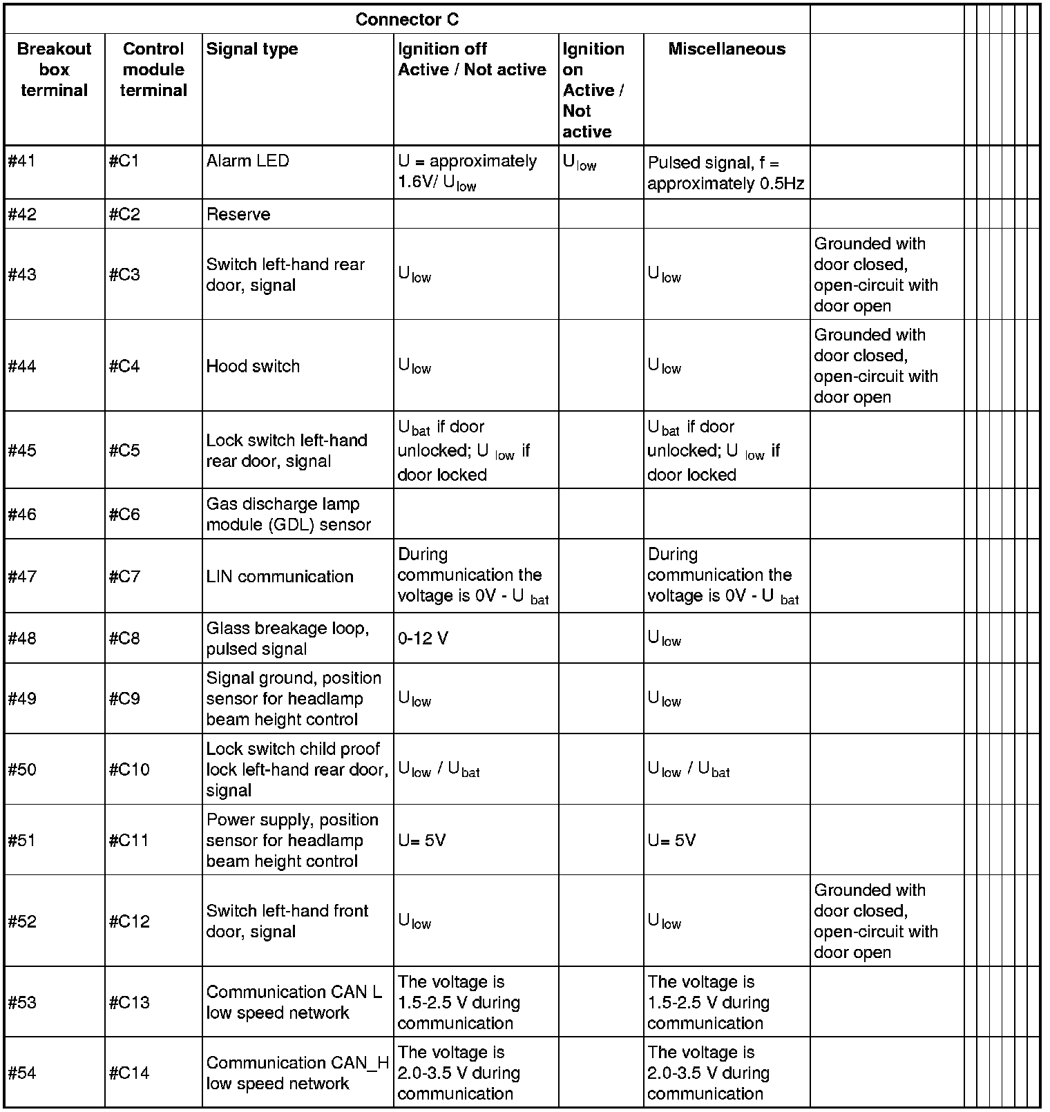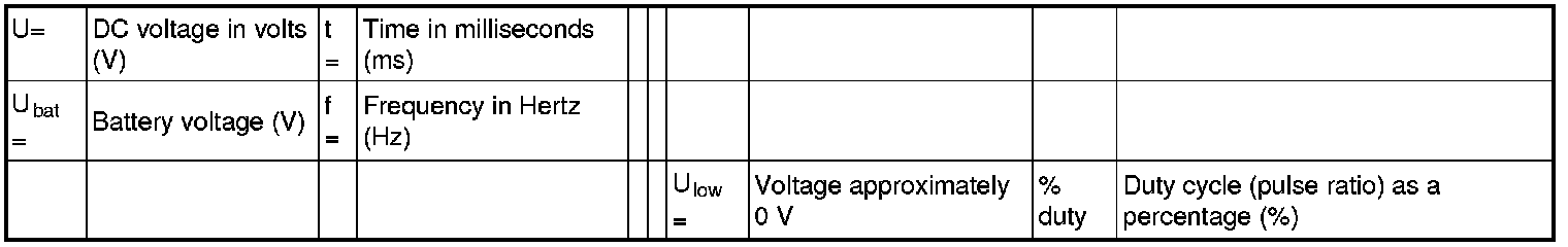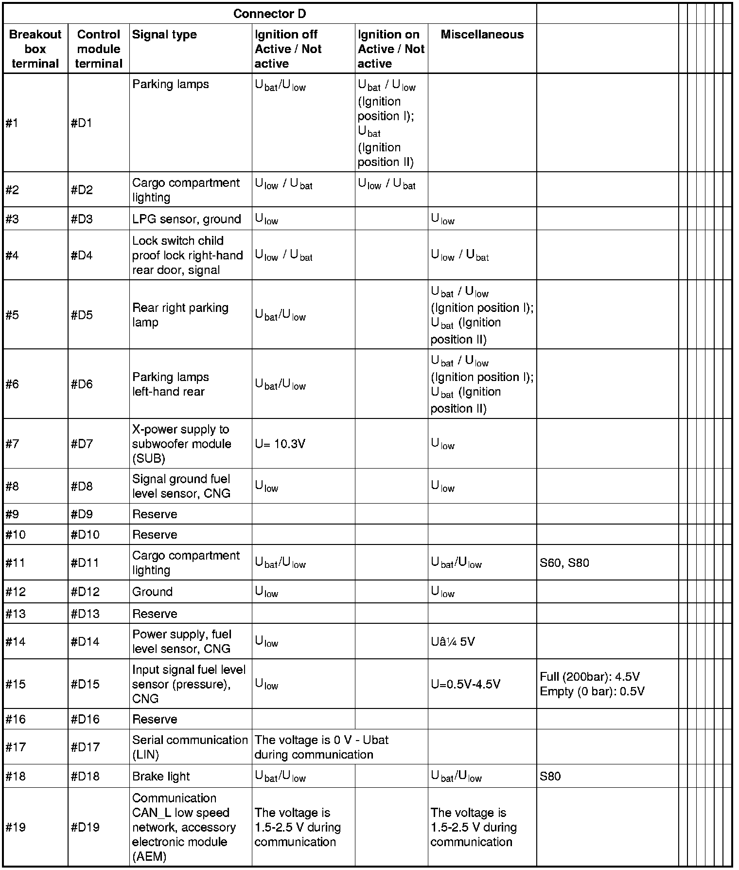 All the values given below are between the terminals stated in column 1 and terminal #D12 in column 2 (power ground). This applies unless otherwise indicated in the last column.
