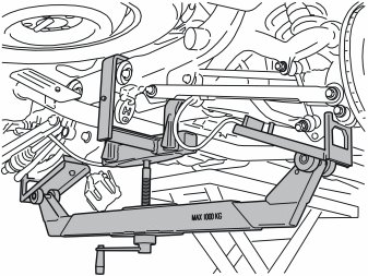 - Position the workshop hoist under the rear eyelet for the shock absorber mounting in the control arm