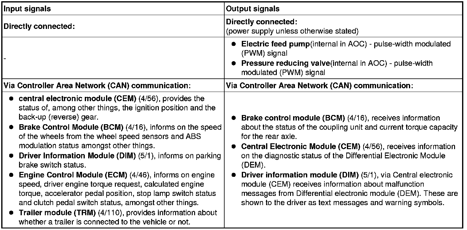 The table below summarizes input and output signals to and from the Differential Electronic Module (DEM). The illustration below displays the same information with the Volvo component designations.