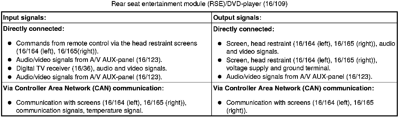 The Rear seat entertainment module (RSE) can receive signals from the DVD player, AUX input and USB input in the Integrated Audio Module (IAM), digital TV signals from the Television Module (TVM) and signals from the directly connected A/V AUX-panel. The Rear seat entertainment module (RSE) can also provide output signals to an external screen.